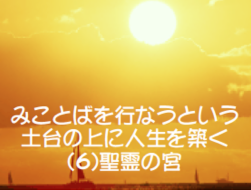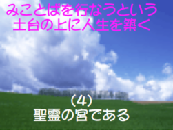 聖霊の宮が、朝起きます。聖霊の宮が学校に行くのです。聖霊の宮が学校で勉強をします。聖霊の宮が友だちと話をし、遊ぶのです。聖霊の宮が、会社に行きます。聖霊の宮が仕事をします。聖霊の宮が、同僚や上司と話をし、交わるのです。聖霊の宮が、恋愛をし、結婚をし、家庭を築き、子育てをするのです。