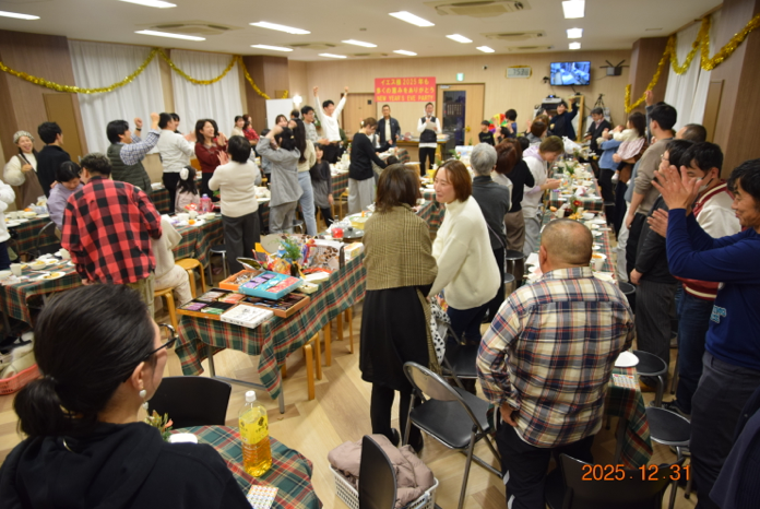 年末のニューイヤーイブパーティでは、ビンゴ大会とクイズ大会が行われました。今回は、400点を超える賞品が用意され、多くの人が賞品を手にしました。中には、袋がいっぱいになるほどの賞品を手にした人もいました。