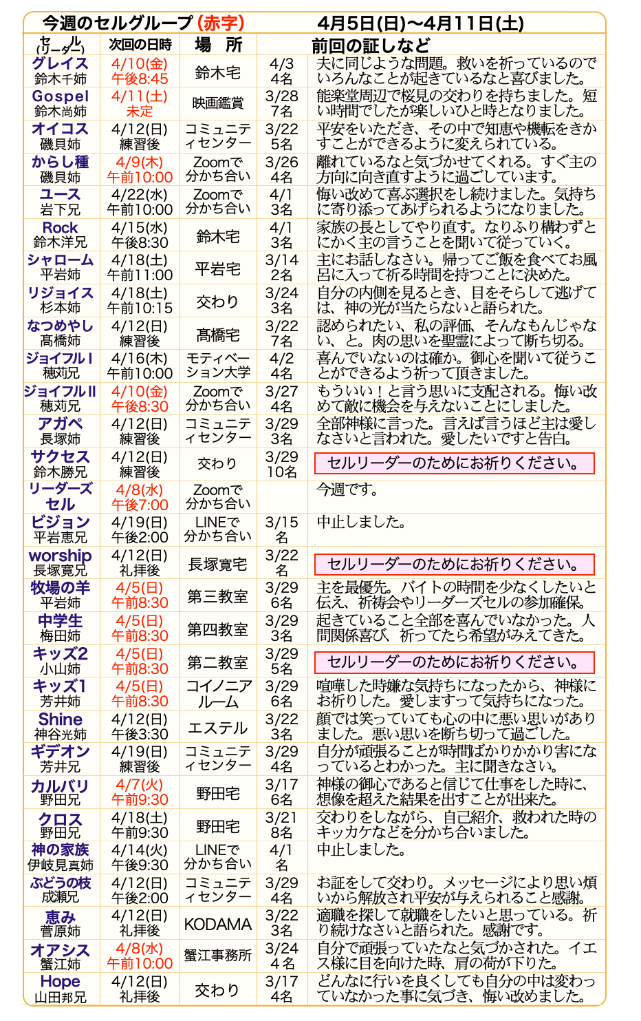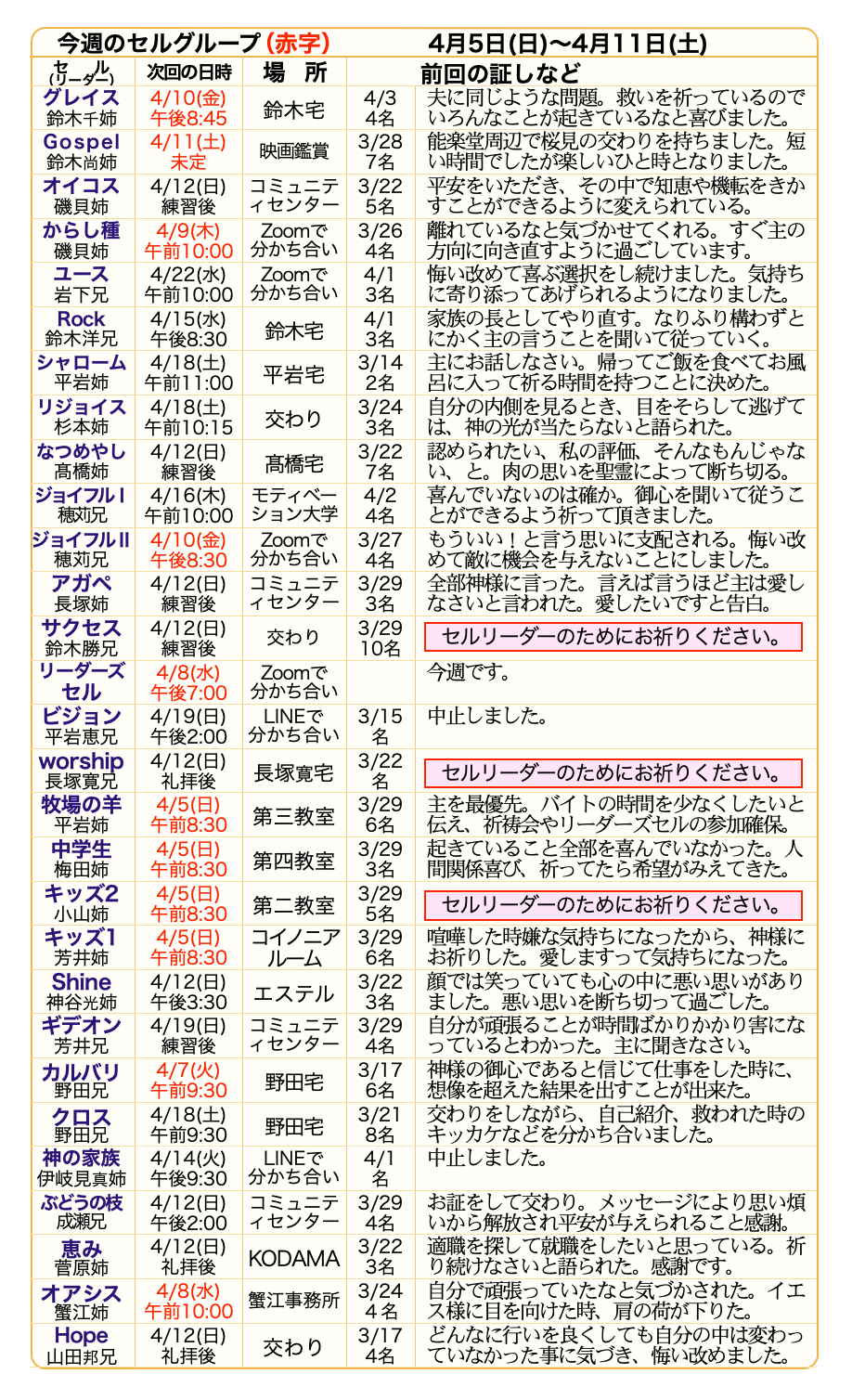 第2水曜日 リーダーズセル 午後7:00~8:30